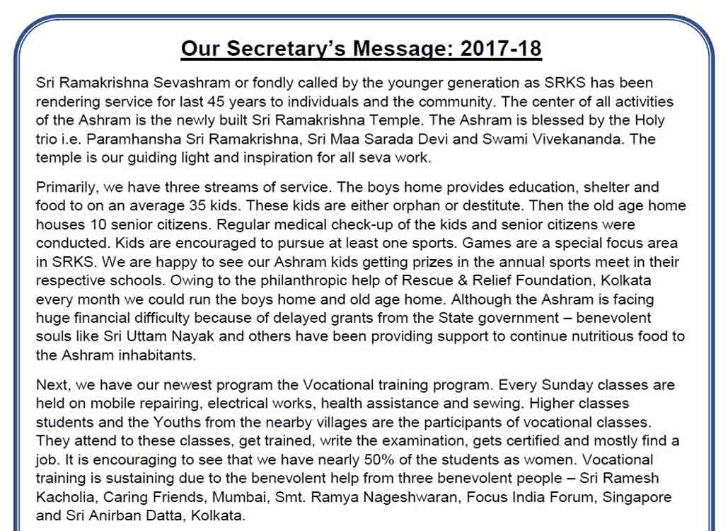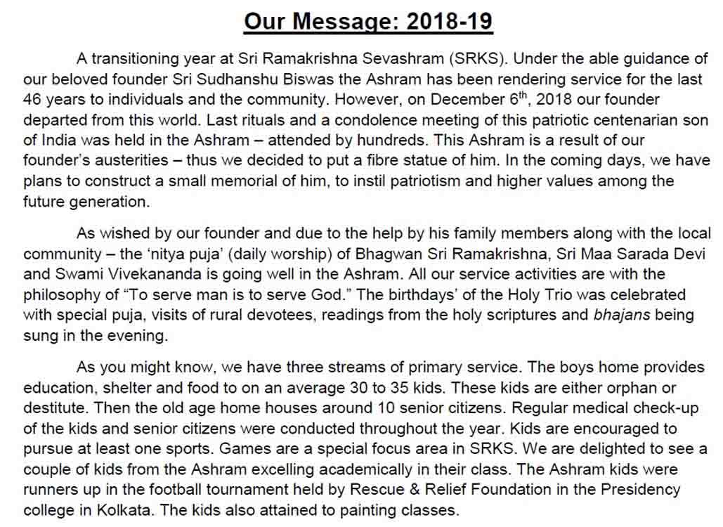 Yet again we do not put forward the numbers to showcase the impact, rather it's the smiles of the beneficiaries and the faith of hundreds of the well wishers that bonds Sri Ramakrishna Sevashram together.